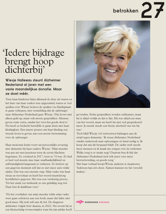 Wiesje Hallewas steunt Alzheimer al jaren met een valse maandelijkse donatie. Maar ze doet méér.