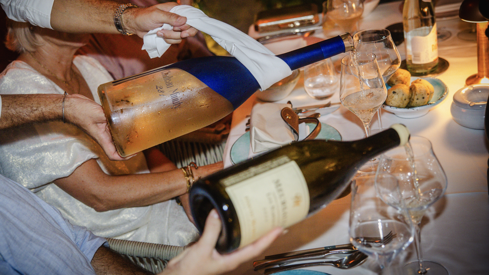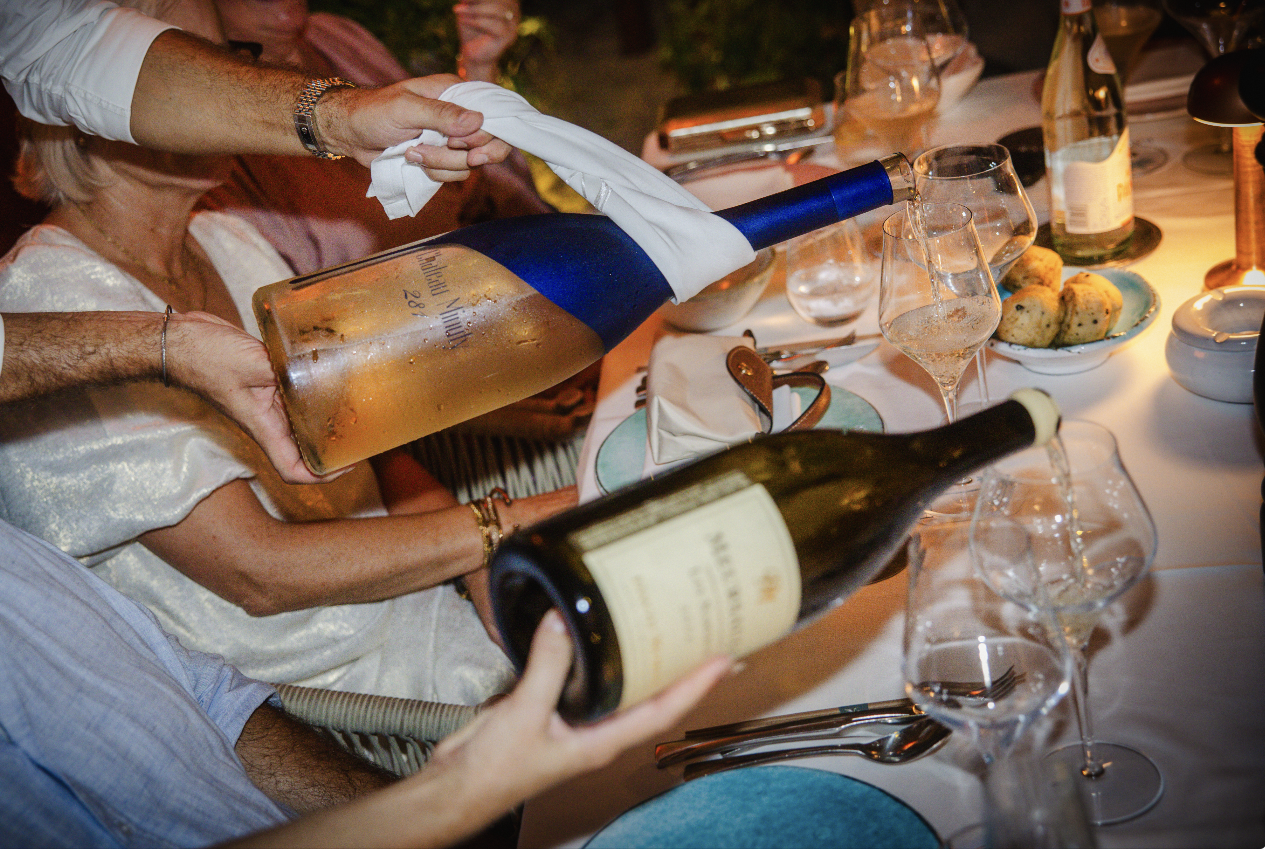 ’s Avonds ging het feest verder bij La Môme Plage, met de voeten in het zand, shared dining en een spectaculaire Ruinart-champagneboot met vuurwerk en dansers als finale.