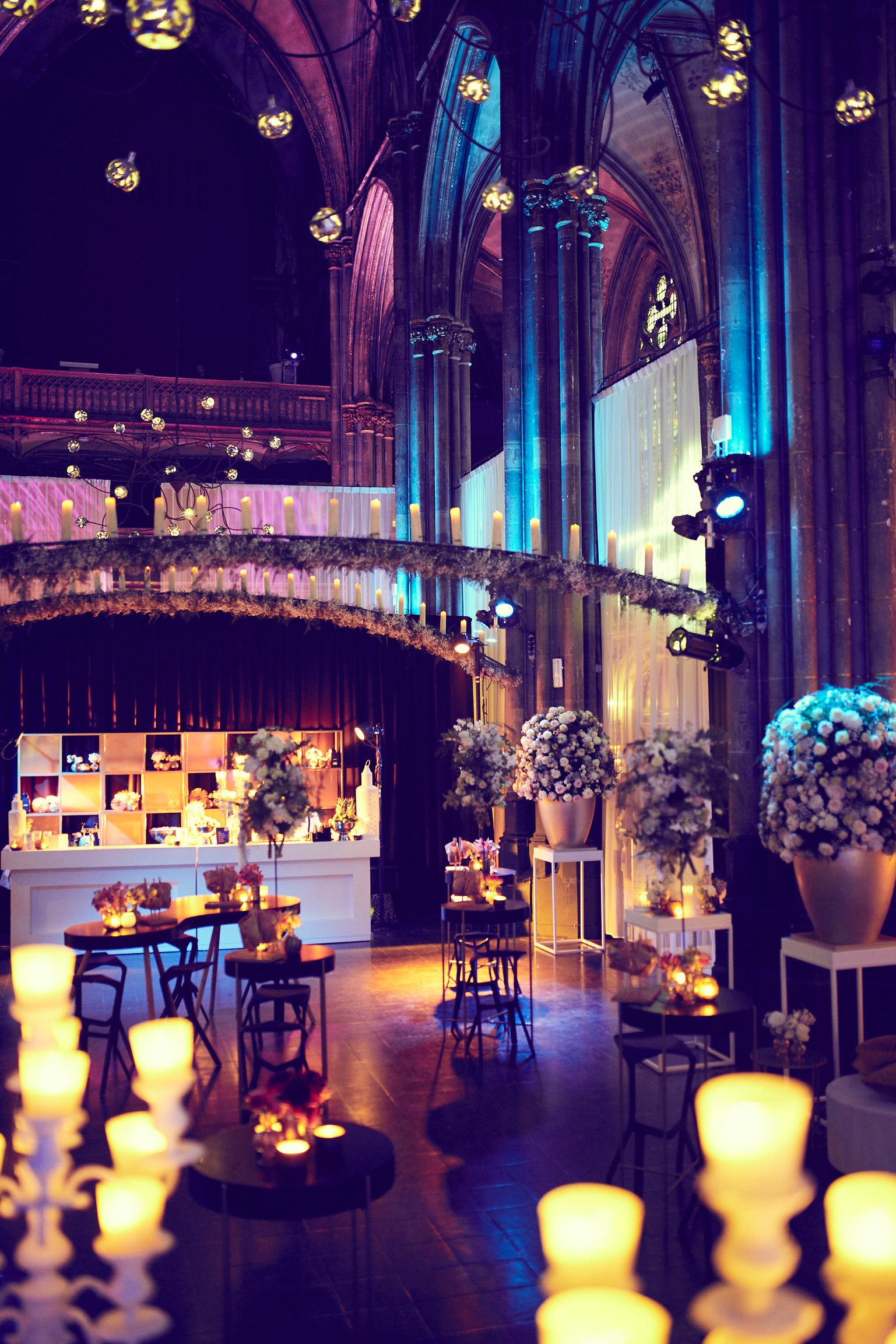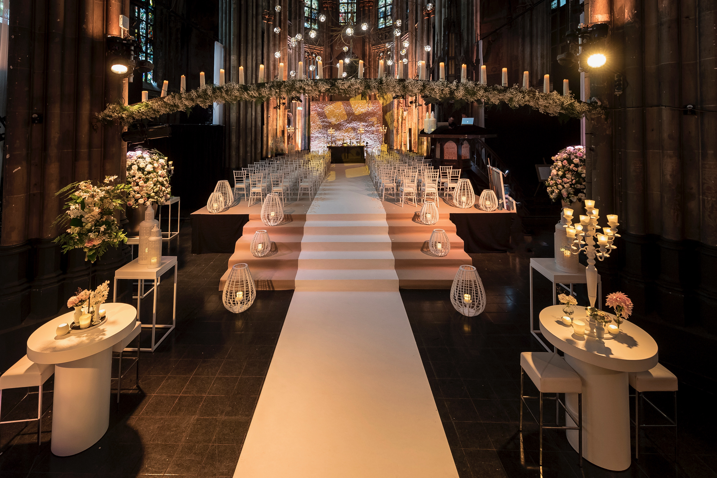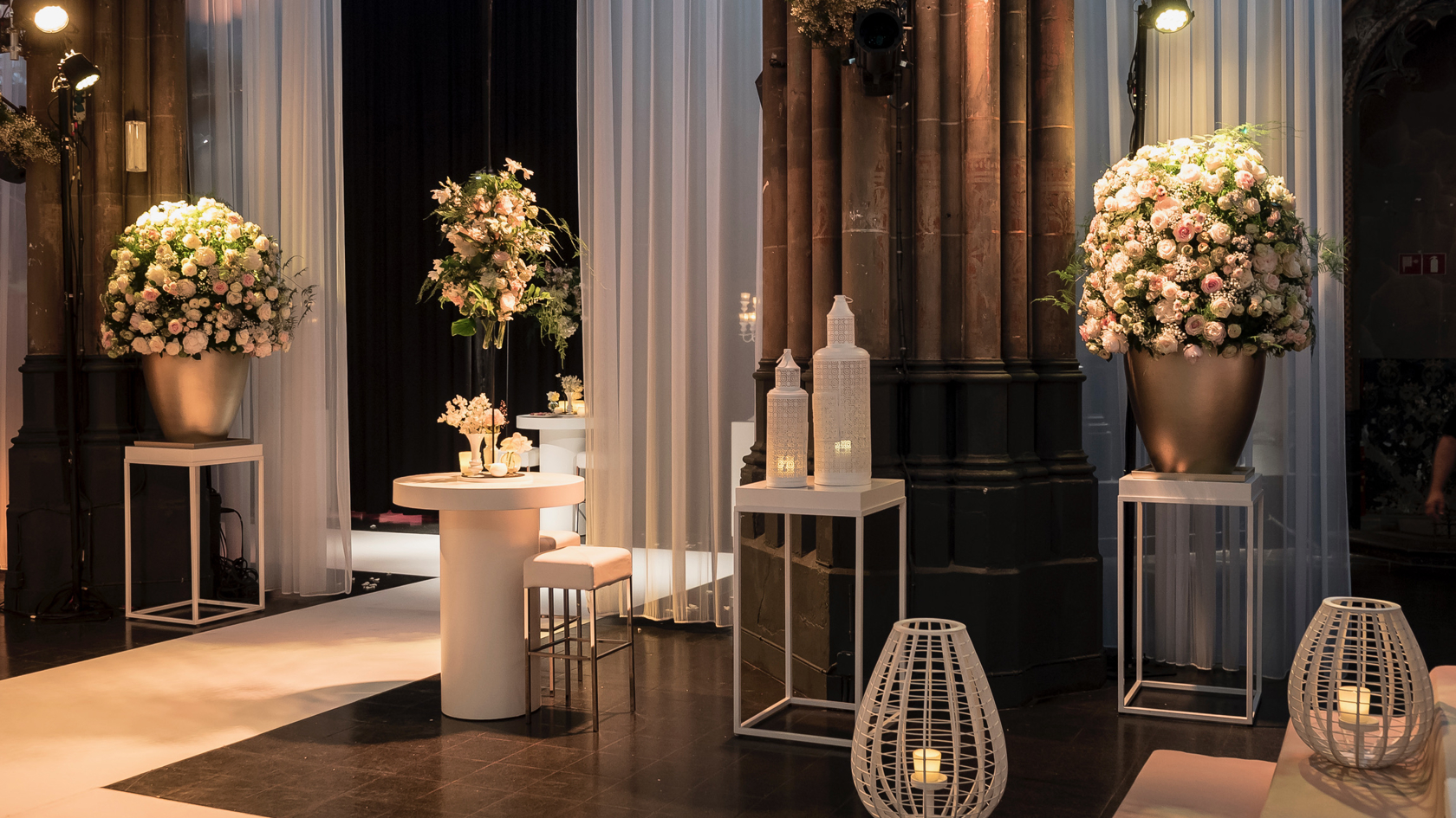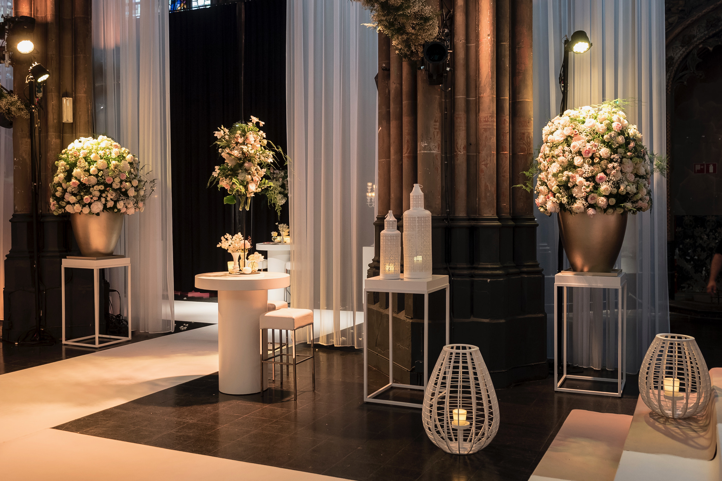 De Orangerie in Den Bosch is een plek die in één dag in meerdere werelden kan veranderen; zo bleek tijdens het zomerhuwelijk van Rick Karsdorp en Astrid. Van een altaar met een acht meter lange bloemenwand tot een romantisch kaarsverlicht diner, en afsluitend een stralend feest. De authentieke kerk in Den Bosch bouwden we voor elk speciaal moment op de dag om tot een heel eigen sprookjeswereld. Elk nieuw decor was een wonderlijke verrassing voor de gasten. Deze historische plek is het perfecte samenspel van modern en klassiek, met zijn subtiele muurschilderingen en kleurrijke glas in lood ramen.