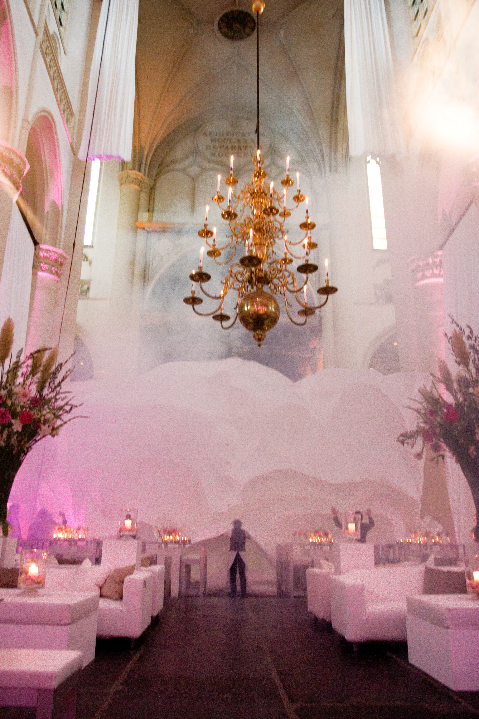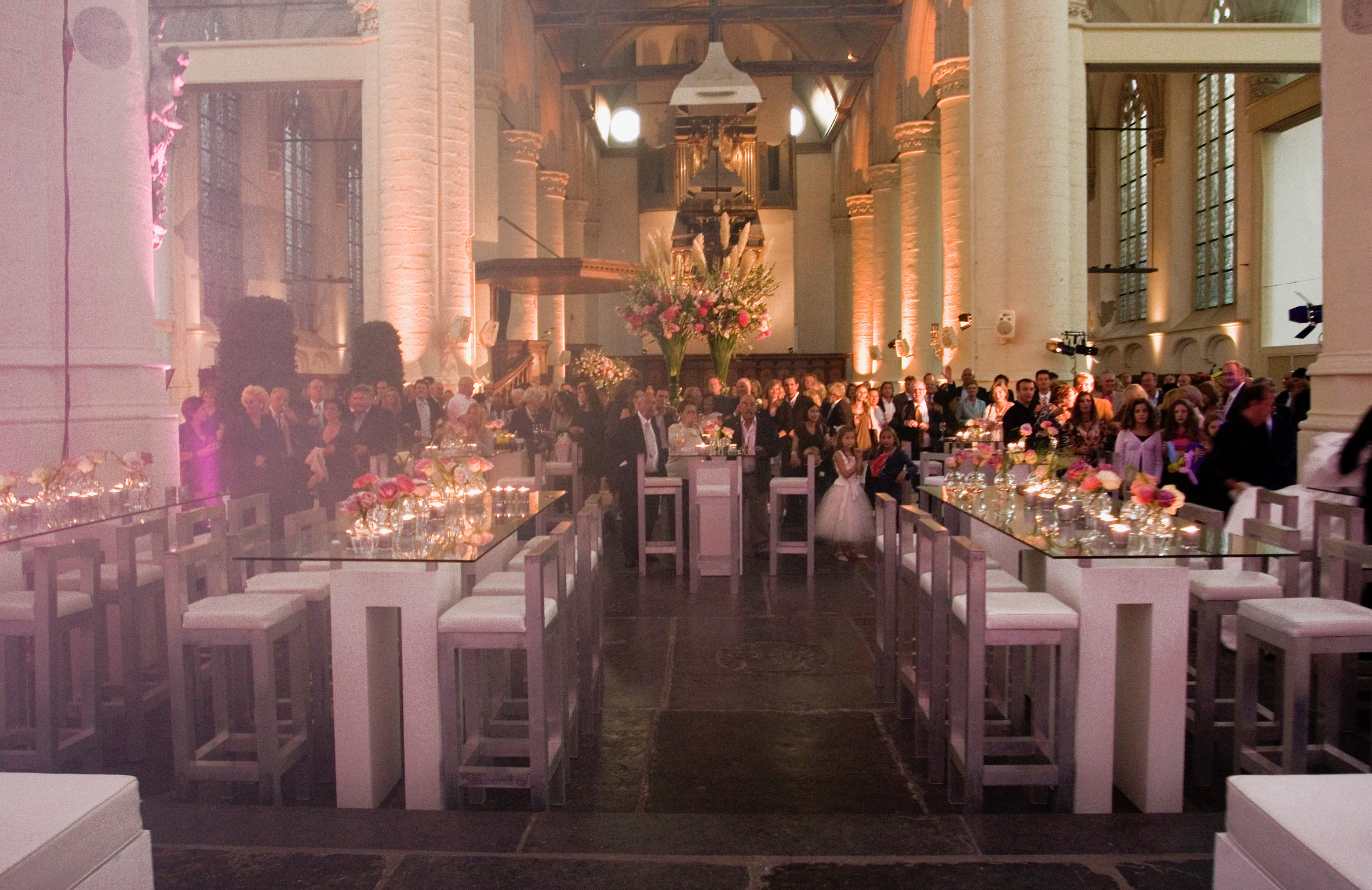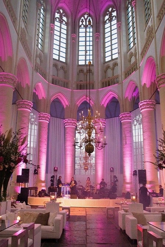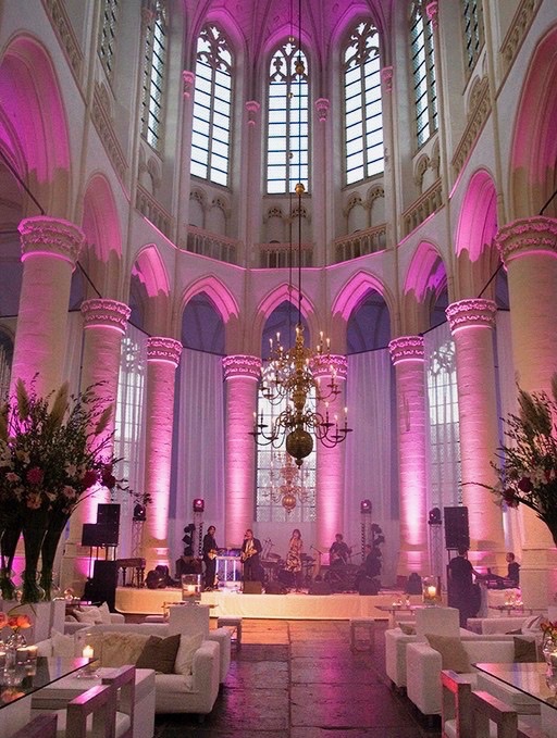 Het oorspronkelijke plan was een kleine en intieme bruiloft voor 25 gasten die na de ceremonie thuis ontvangen zouden worden. Maar na drie jaar verbouwen, was het huis nog steeds niet af en om de bruiloft nu wéér uit te stellen… “dan gaan we tóch trouwen, maar dan niet een hele dag”, zo was de wens van de bruidegom. Prima, dan doen we de ceremonie om 17.30 uur . Het geluk was met hen, want precies de locatie die het bruidspaar al jarenlang als wens had, was beschikbaar en voor het entertainment gold hetzelfde. Midden in de nacht kwamen de opbouwteams van podiumbouwers, licht & geluid, bloemist, en cateraar om alles neer te zetten. Rond het middaguur was de kerk een sprookje en na de soundcheck van de diverse artiesten was alles en iedereen er klaar voor. Langzaam druppelden de gasten binnen langs het draaiorgel en een witte wensfee op stelten, die kaartjes uitdeelde waarop een gelukswens voor het bruidspaar kon worden geschreven.