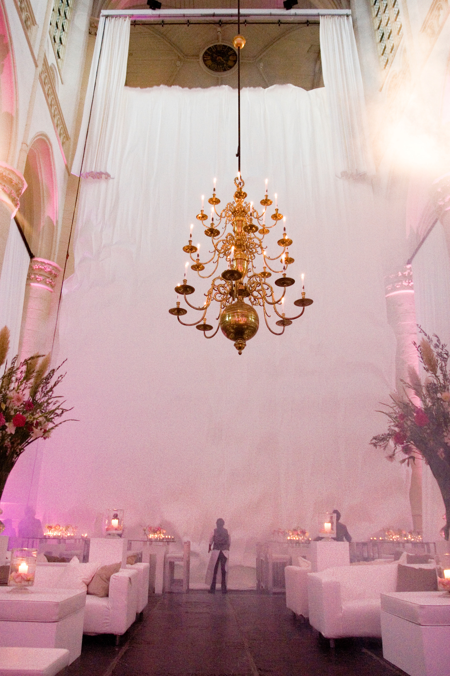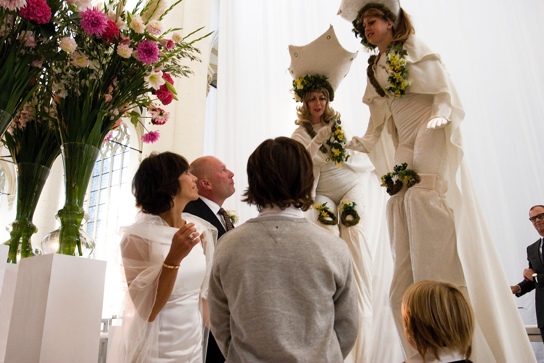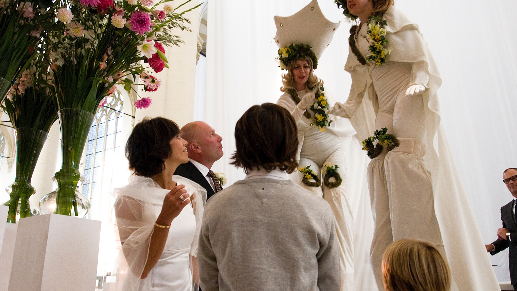Het oorspronkelijke plan was een kleine en intieme bruiloft voor 25 gasten die na de ceremonie thuis ontvangen zouden worden. Maar na drie jaar verbouwen, was het huis nog steeds niet af en om de bruiloft nu wéér uit te stellen… “dan gaan we tóch trouwen, maar dan niet een hele dag”, zo was de wens van de bruidegom. Prima, dan doen we de ceremonie om 17.30 uur . Het geluk was met hen, want precies de locatie die het bruidspaar al jarenlang als wens had, was beschikbaar en voor het entertainment gold hetzelfde. Midden in de nacht kwamen de opbouwteams van podiumbouwers, licht & geluid, bloemist, en cateraar om alles neer te zetten. Rond het middaguur was de kerk een sprookje en na de soundcheck van de diverse artiesten was alles en iedereen er klaar voor. Langzaam druppelden de gasten binnen langs het draaiorgel en een witte wensfee op stelten, die kaartjes uitdeelde waarop een gelukswens voor het bruidspaar kon worden geschreven.