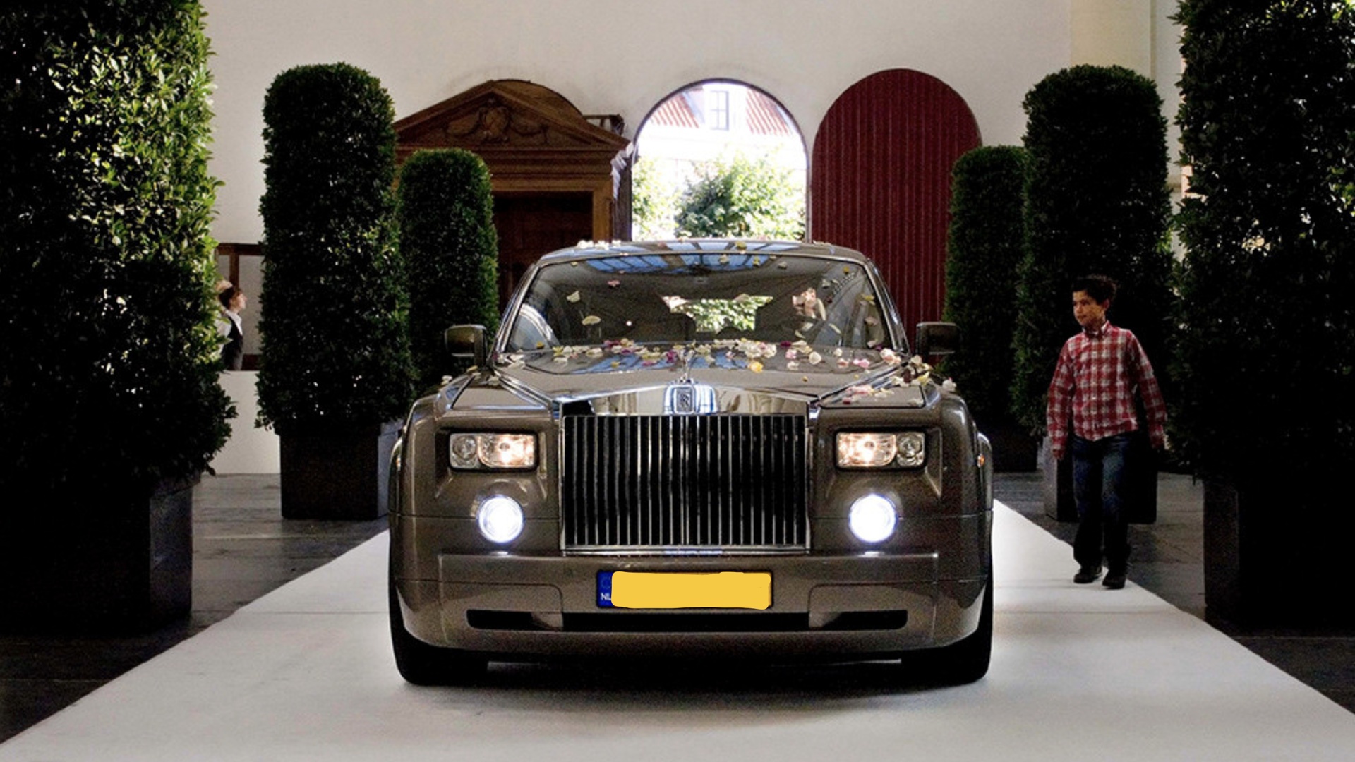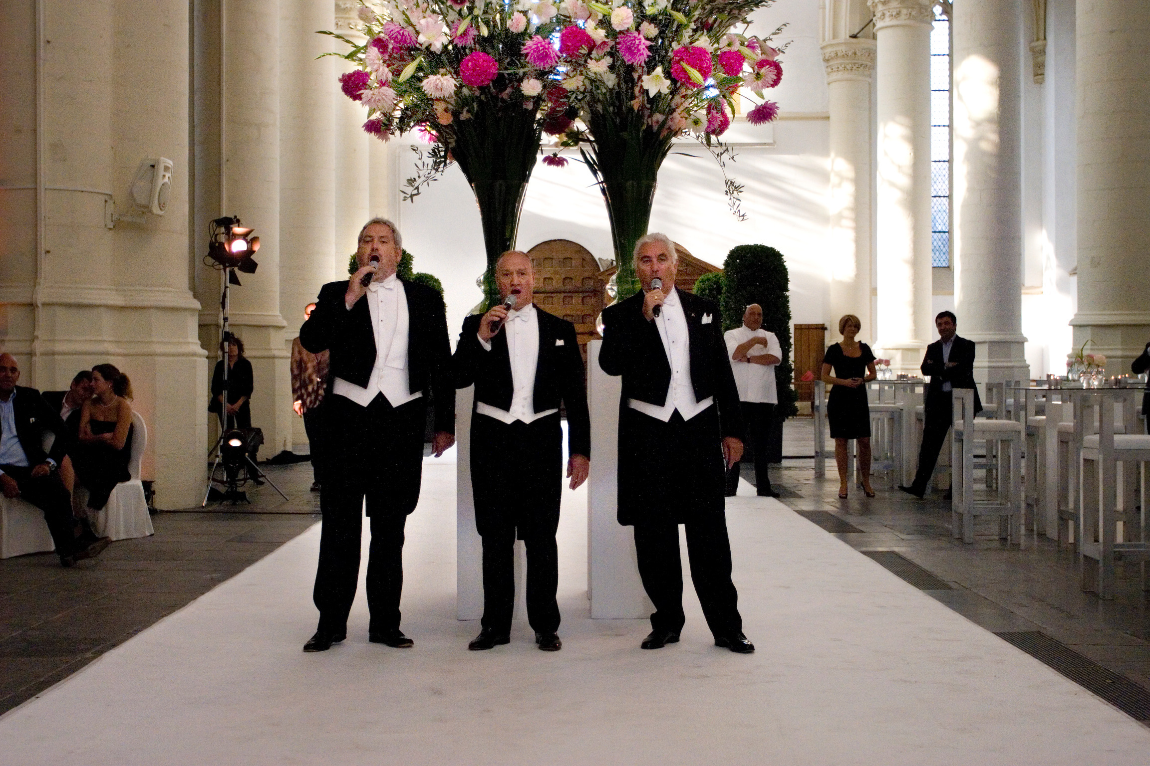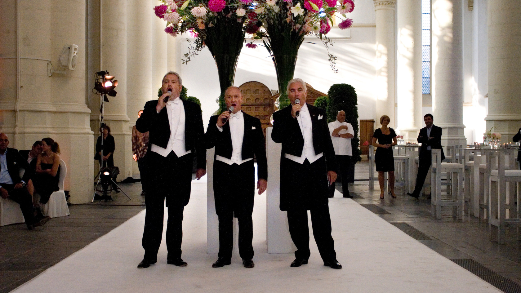 "Over een 70 meter witte loper, afgezet met laurierzuilen en bestrooid met rozenblaadjes, kwam een rolls royce de kerk binnen. De drie baritons stonden ze op te wachten en zongen een prachtige medley."