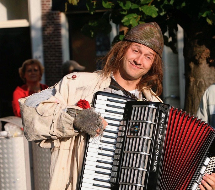 We traden binnen in het walking dinner-gedeelte met statafels, heerlijke zitjes en loungebanken. Details zoals een clochard die accordeon speelde op het parkeerterrein, een grappige toiletjuffrouw en niet te vergeten de verschrikkelijk foute ober maakten het feest af. Herman den Blijker had voor een aantal bijzondere gerechten gezorgd die erg goed in de smaak vielen. De bruid kon geen genoeg krijgen van de truffelsoep.