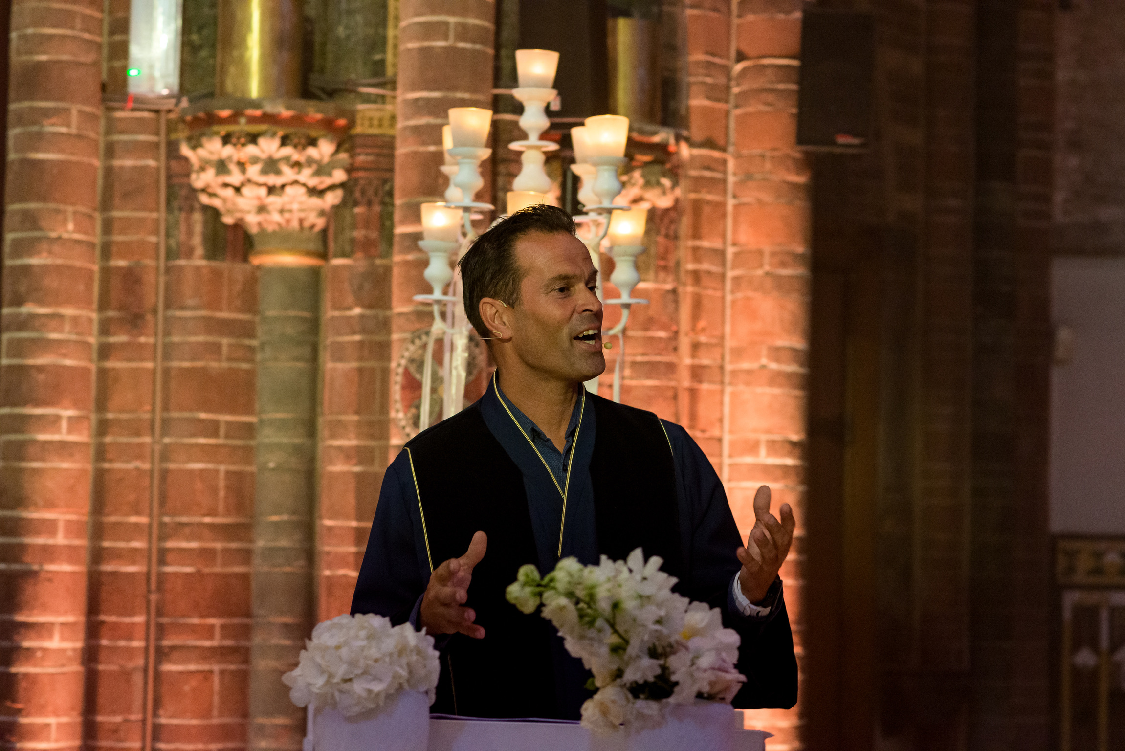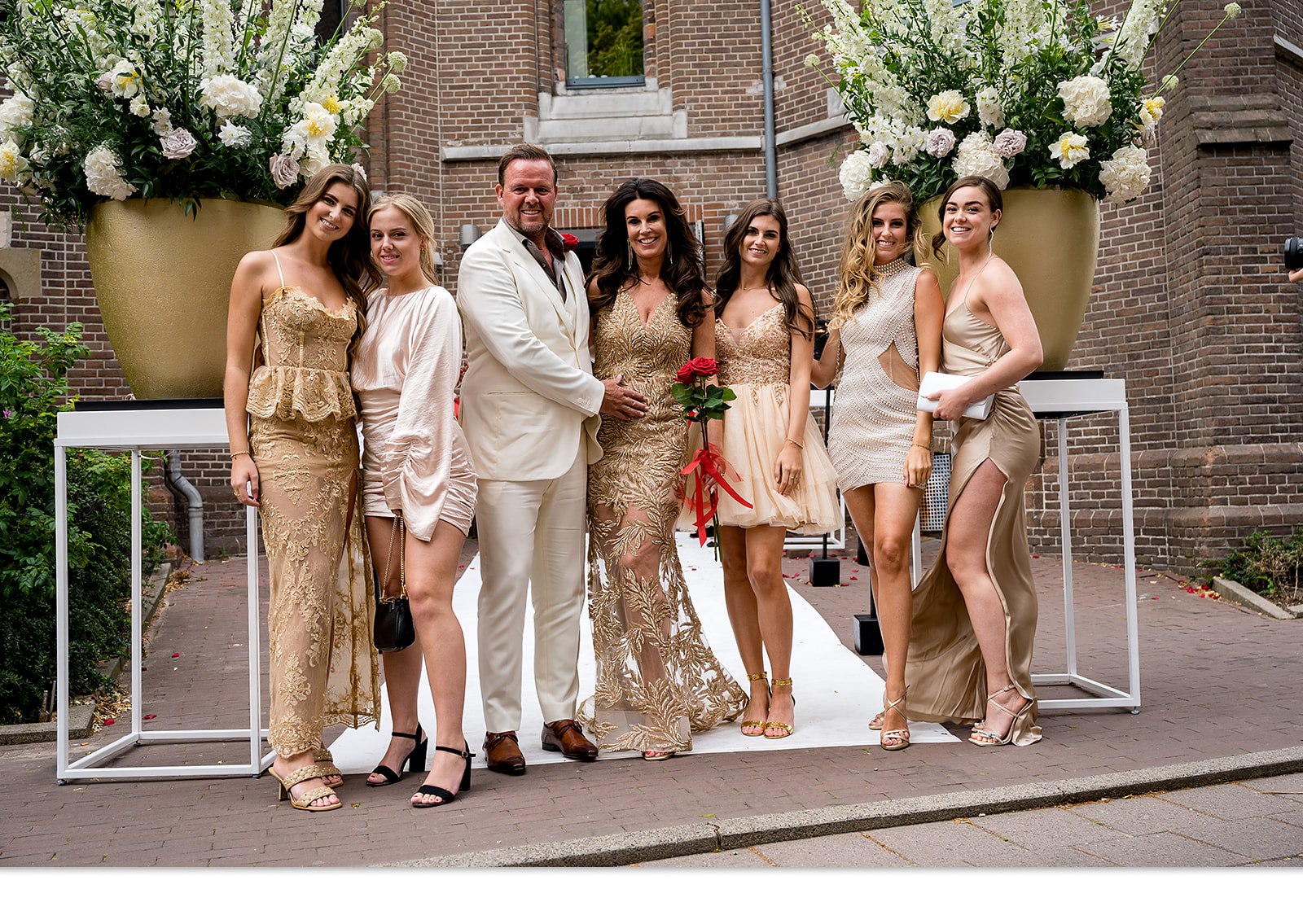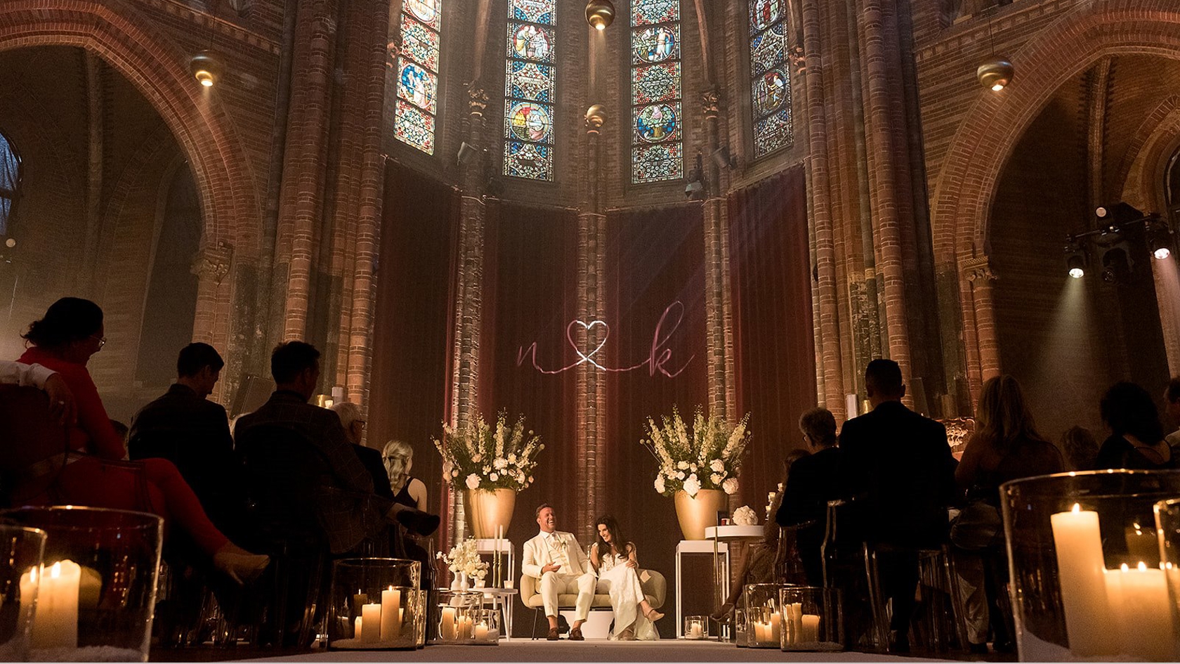 Na de first look stapt het bruidspaar in een witte koets met 4 witte paarden om via het Vondelpark naar de ceremonie te rijden. Alle gasten zitten er klaar voor en zijn samen met hun 5 dochters zijn getuige van de huwelijksvoltrekking door trouwambtenaar Bas Nijhuis en Van Dikhout zingt Tot jij mijn liefde voelt.