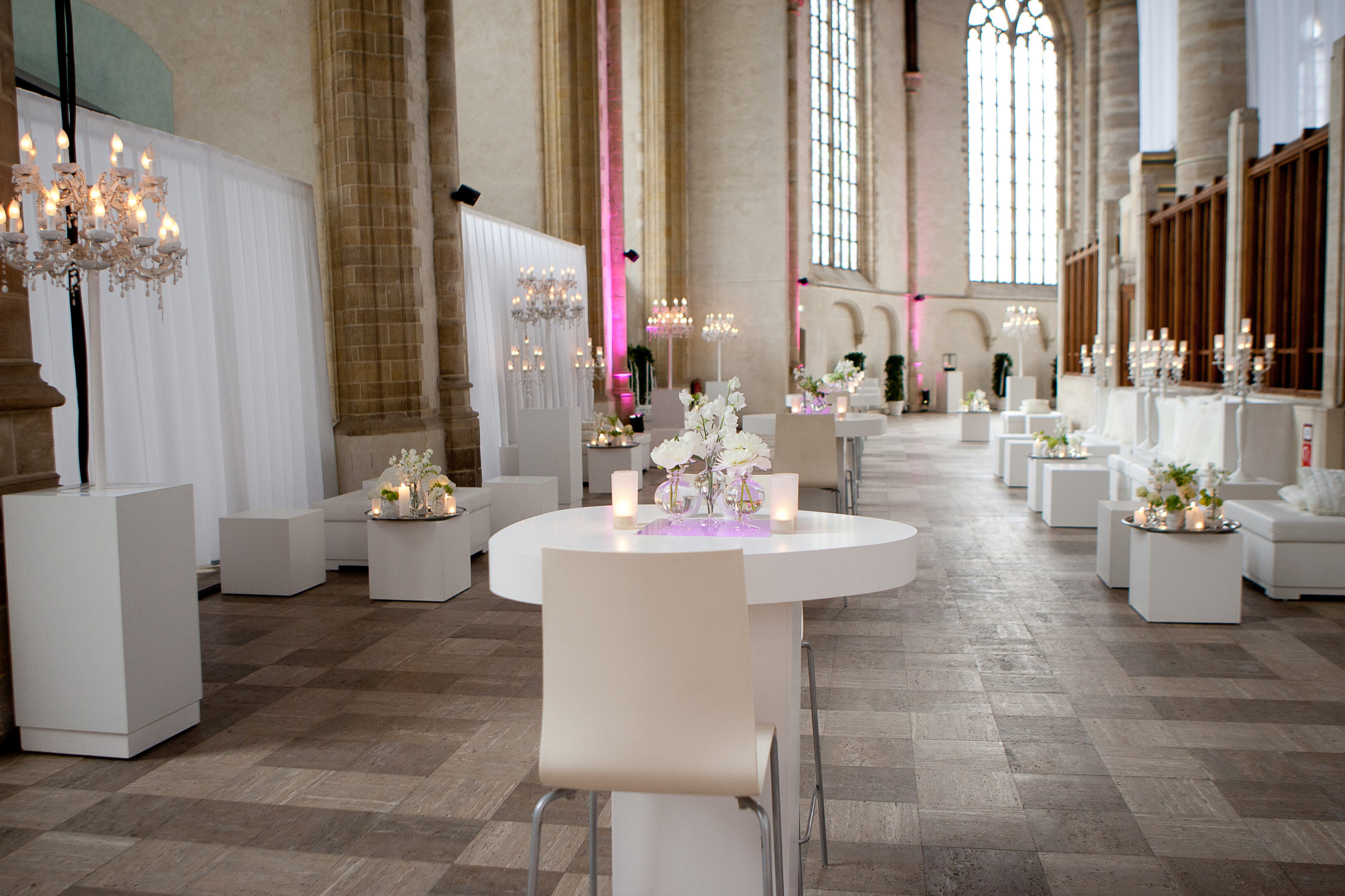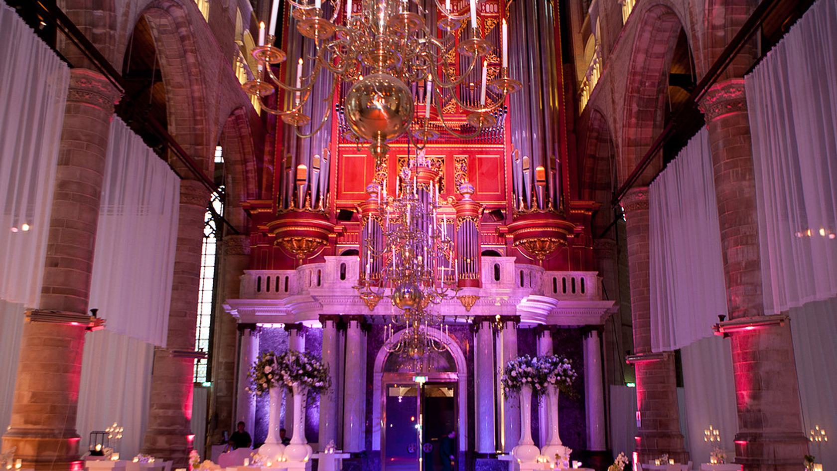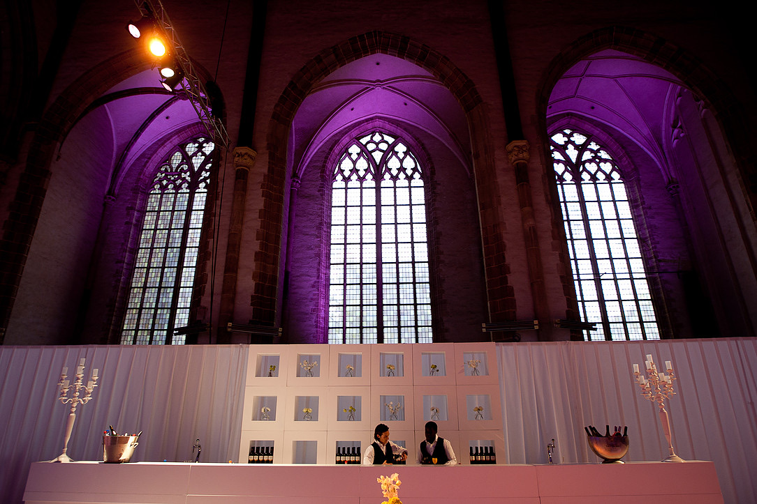 De statige Laurenskerk in Rotterdam was helemaal opgeluisterd met honderden witte bloemstukken, metershoge kaarsen, draperieën en een witte loper om het bruidspaar stijlvol te verwelkomen.